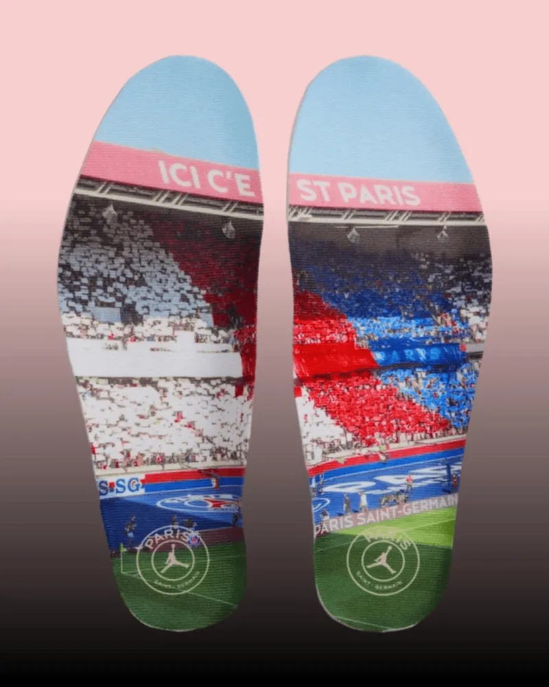 鞋身以黑色防撕裂面料搭配深黑覆层,同时融入大巴黎logo暗纹设计,鞋垫上为大巴黎主场王子公园球场的剪影照片。